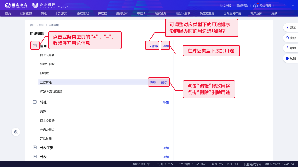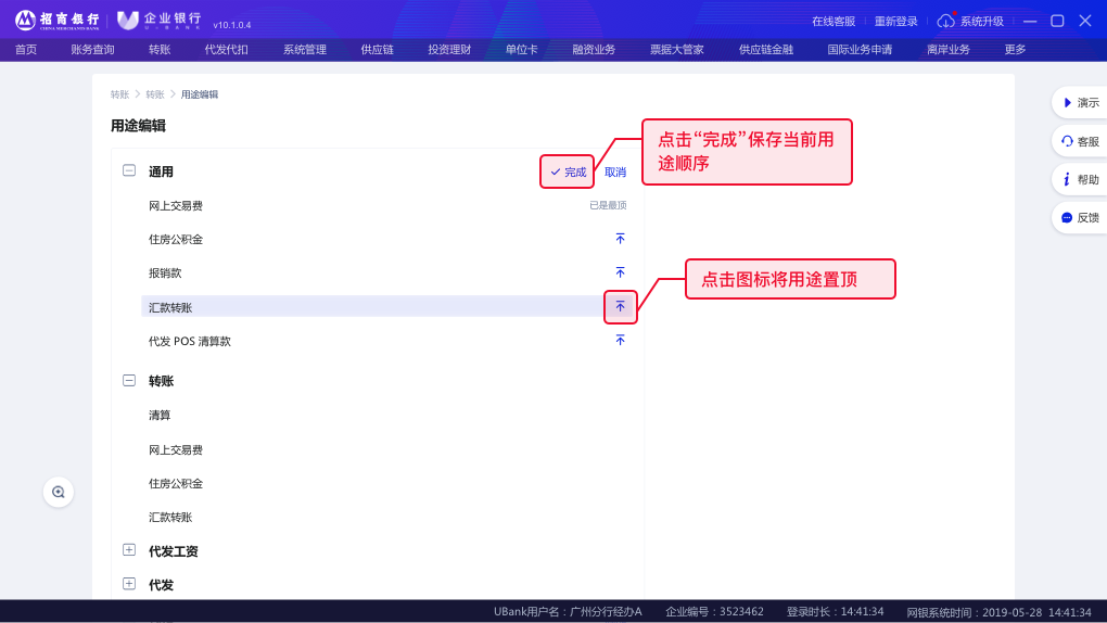可以对不同分类下的用途进行顺序调整,以便于在经办业务时,更快速的找到自己经常使用的用途。具体操作如下: